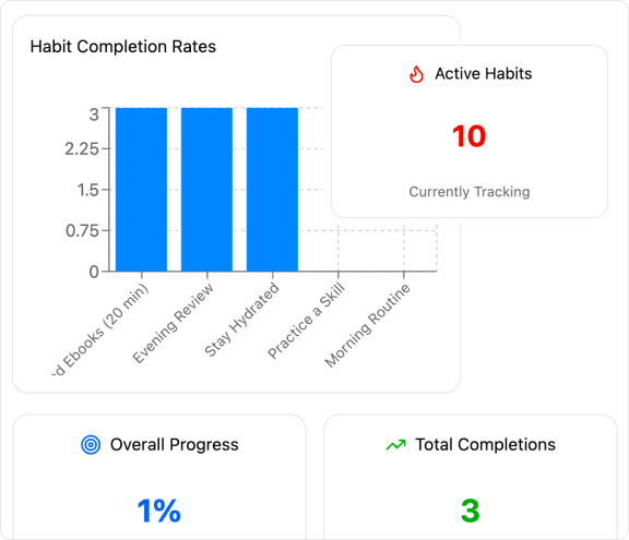 Track active habits, see completion rates by habit, and monitor your overall progress at a glance. Visual charts highlight what’s working, what’s slipping, and where to focus next. Every completed habit counts, every percentage reflects momentum, and every data point helps you make better decisions about your routines. No noise. No vanity metrics. Just honest feedback on how consistently you’re showing up—and where small improvements can unlock real change.
