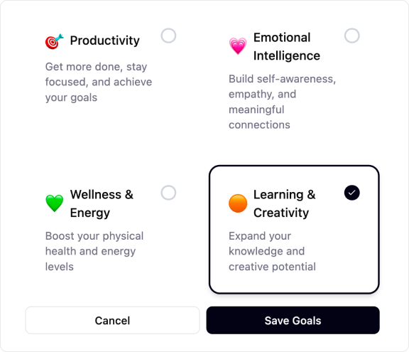 Select the areas you want to focus on — learning, creativity, wellness, productivity, or emotional balance. Selflective uses these choices to shape your personalized growth plan.